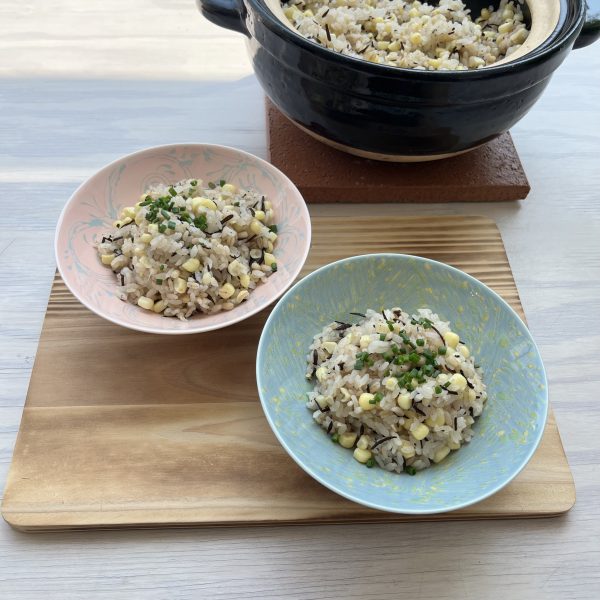 My summer obsession of donabe corn rice has so many variations and this one is my new favorite! I never thought the combination of umeboshi (Japanese pickled plum) and corn make such great combination in flavors. I love making onigiri with this rice to take to picnic!